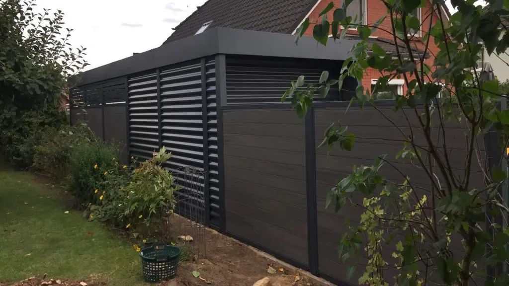 Die Seitenverkleidung eines Stahlcarports kann unbegrenzt als Sichtschutzzaun weitergeführt werden.