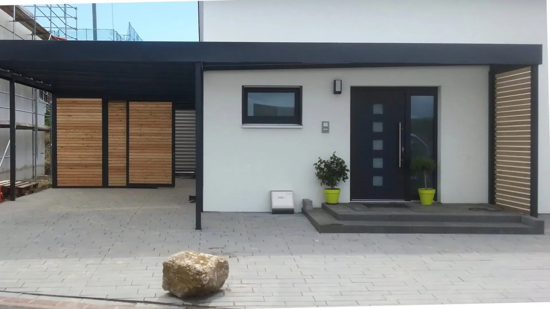 Als Farbe für diesen Carport mit Eingangsüberdachung wurde RAL 7016 anthrazit gewählt.