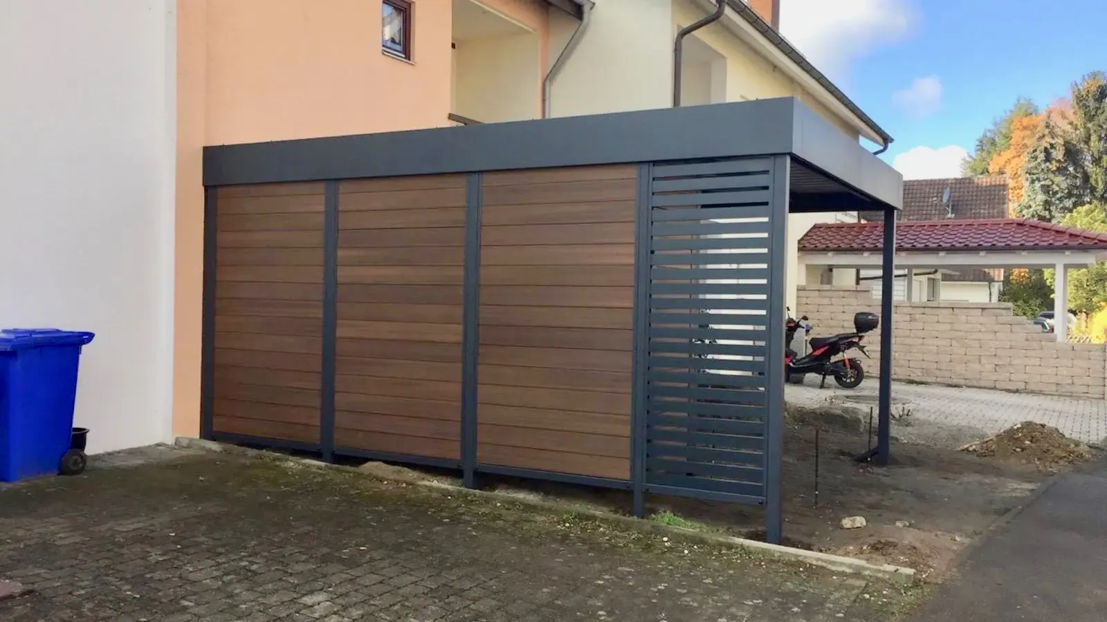 Bei diesem Carport mit Eingangsüberdachung in Baden-Württemberg konnte unser Kunde von Beginn an auf zahlreiche Serviceleistungen von der Projektplanung bis zur Montage setzen.