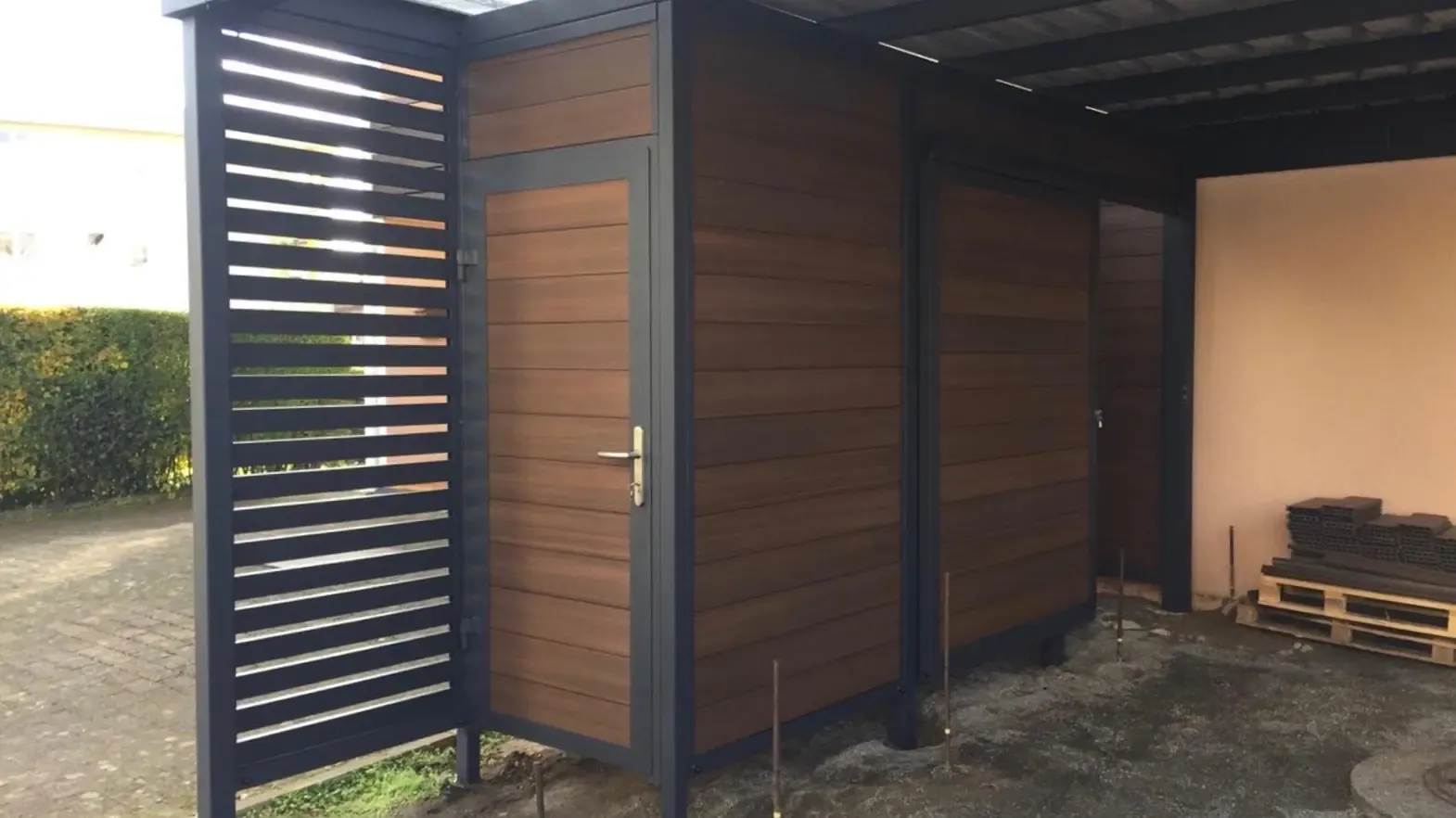 Als Farbe für diesen Carport mit Eingangsüberdachung wurde RAL 7016 anthrazit gewählt.