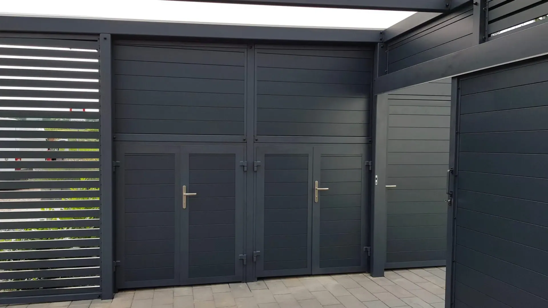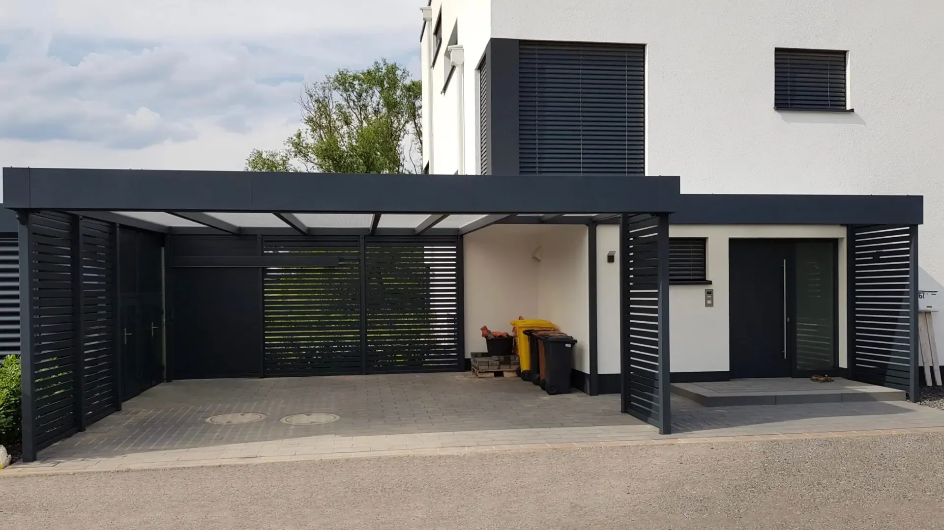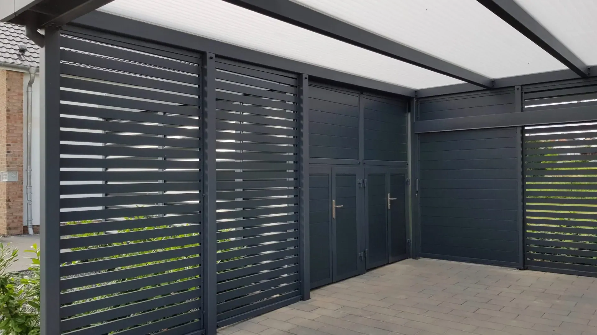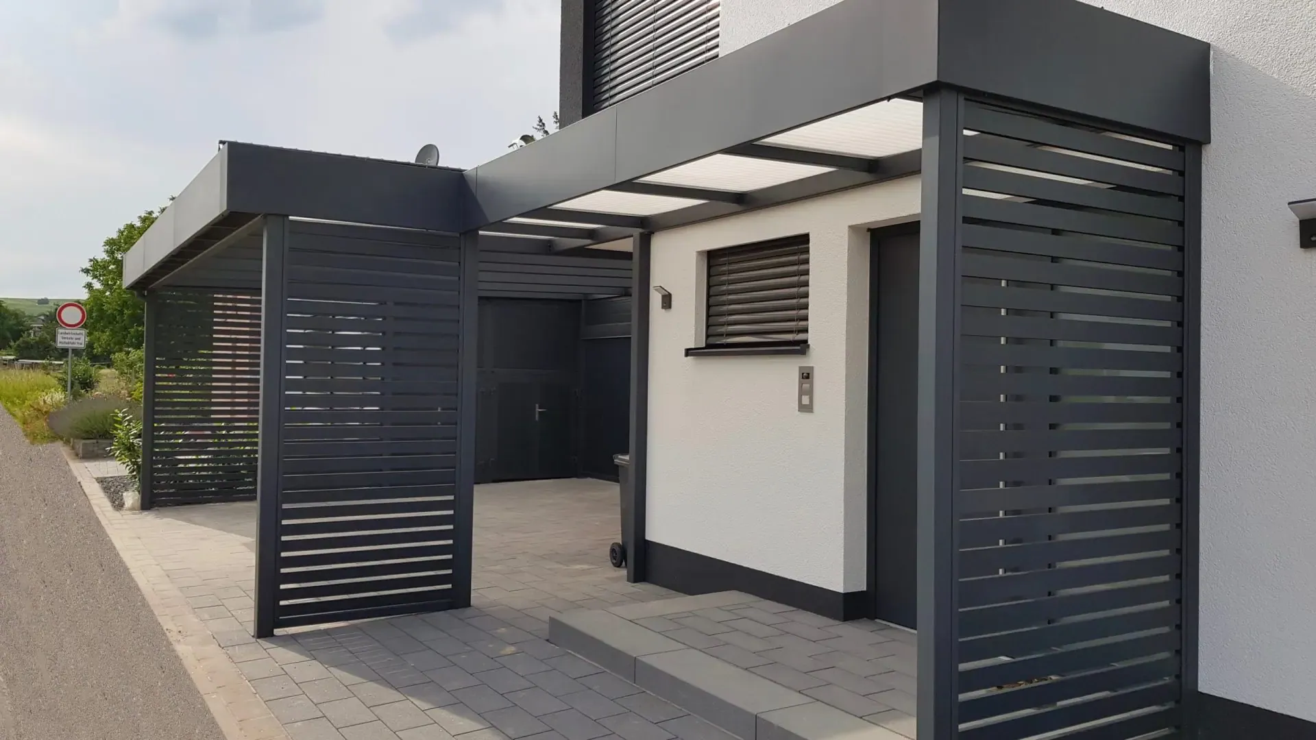 Als Farbe für diesen Carport mit Eingangsüberdachung wurde RAL 7016 anthrazit gewählt.