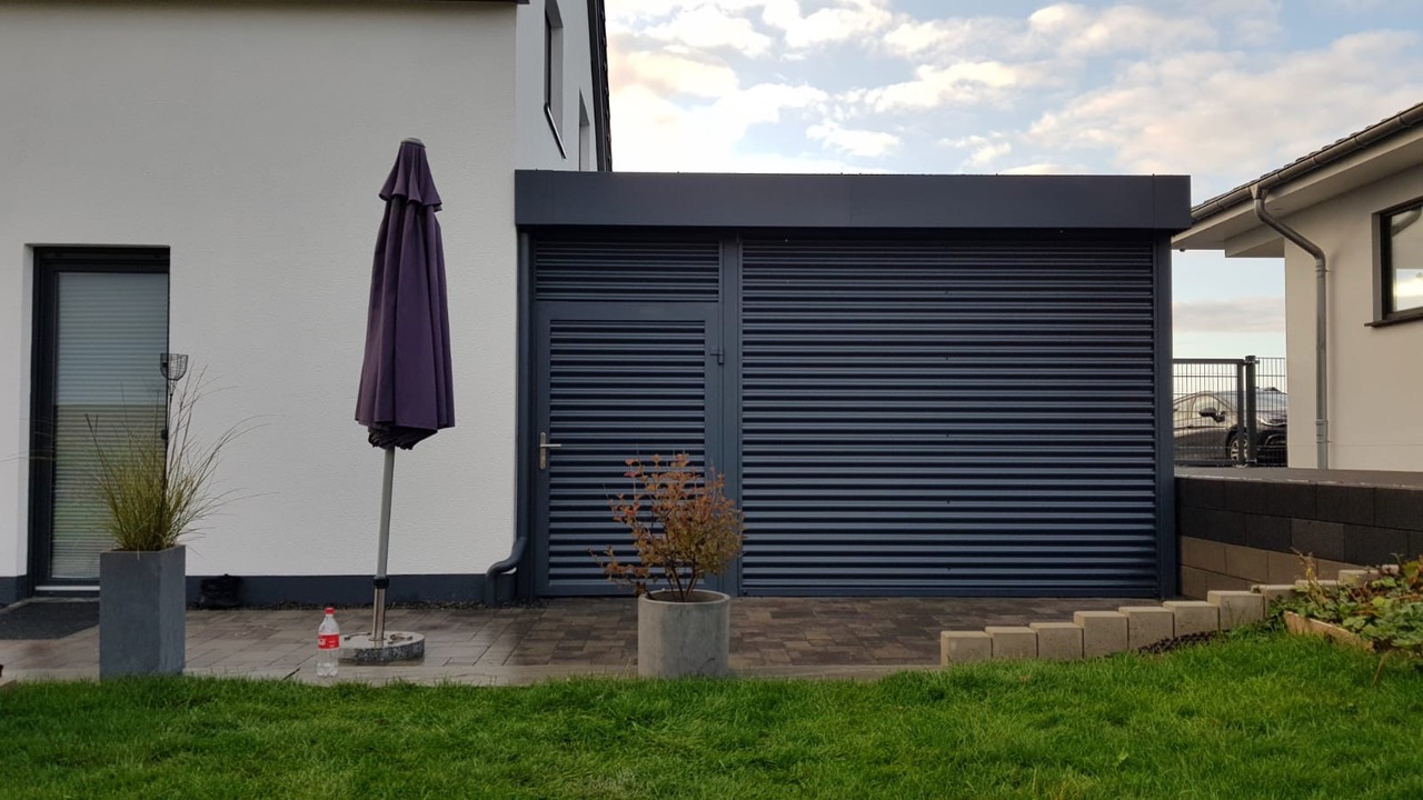 Als Farbe für diesen Carport mit Eingangsüberdachung wurde RAL 7016 anthrazit gewählt.