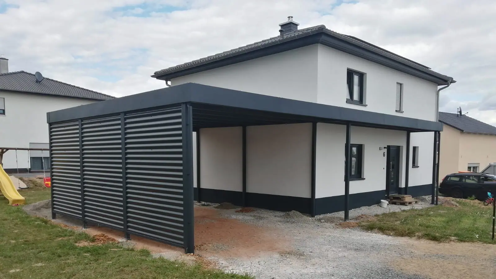 Als Farbe für diesen Carport mit Eingangsüberdachung wurde RAL 7016 anthrazit gewählt.