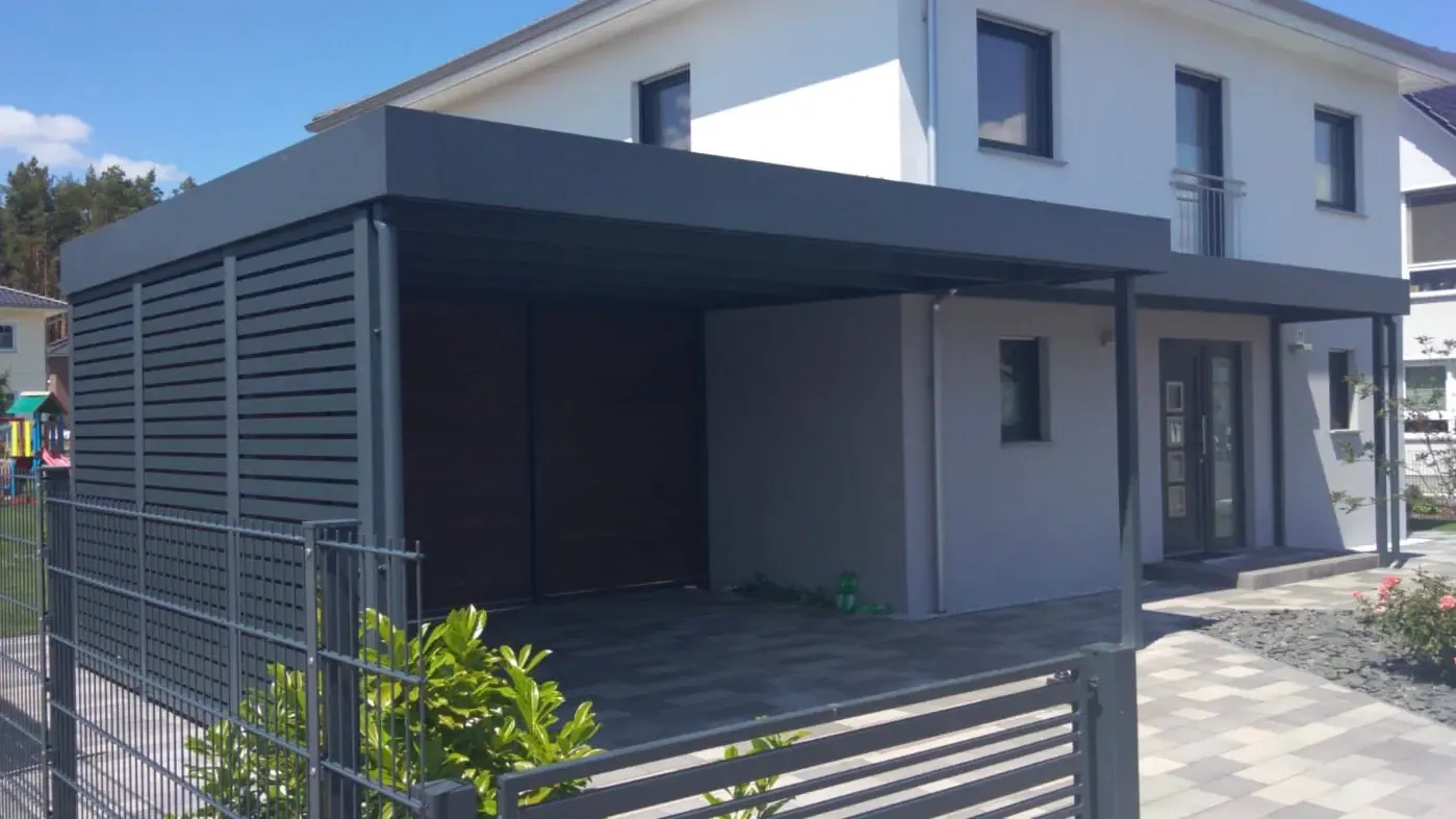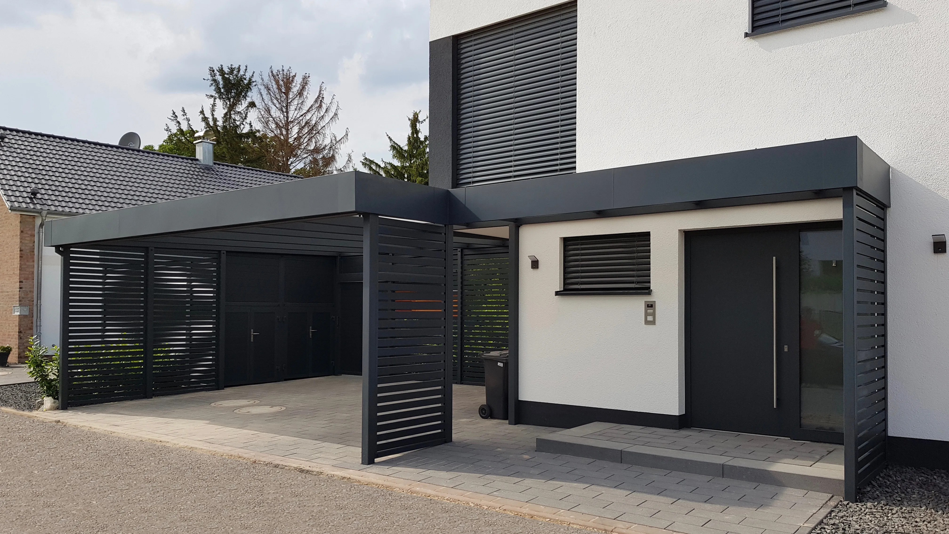 Es ist eine Herausforderung, Eingangsüberdachungen perfekt in Carports oder Doppelcarports nach Maß zu integrieren. In den meisten Projekten geht es dabei nicht nur um die Integration der Überdachung des Hauseingangs, sondern zusätzlich um die Kombination von Schuppen, Sichtschutz, Mülleinhausung oder Zugangsmöglichkeiten durch Türen in den Gartenbereich.