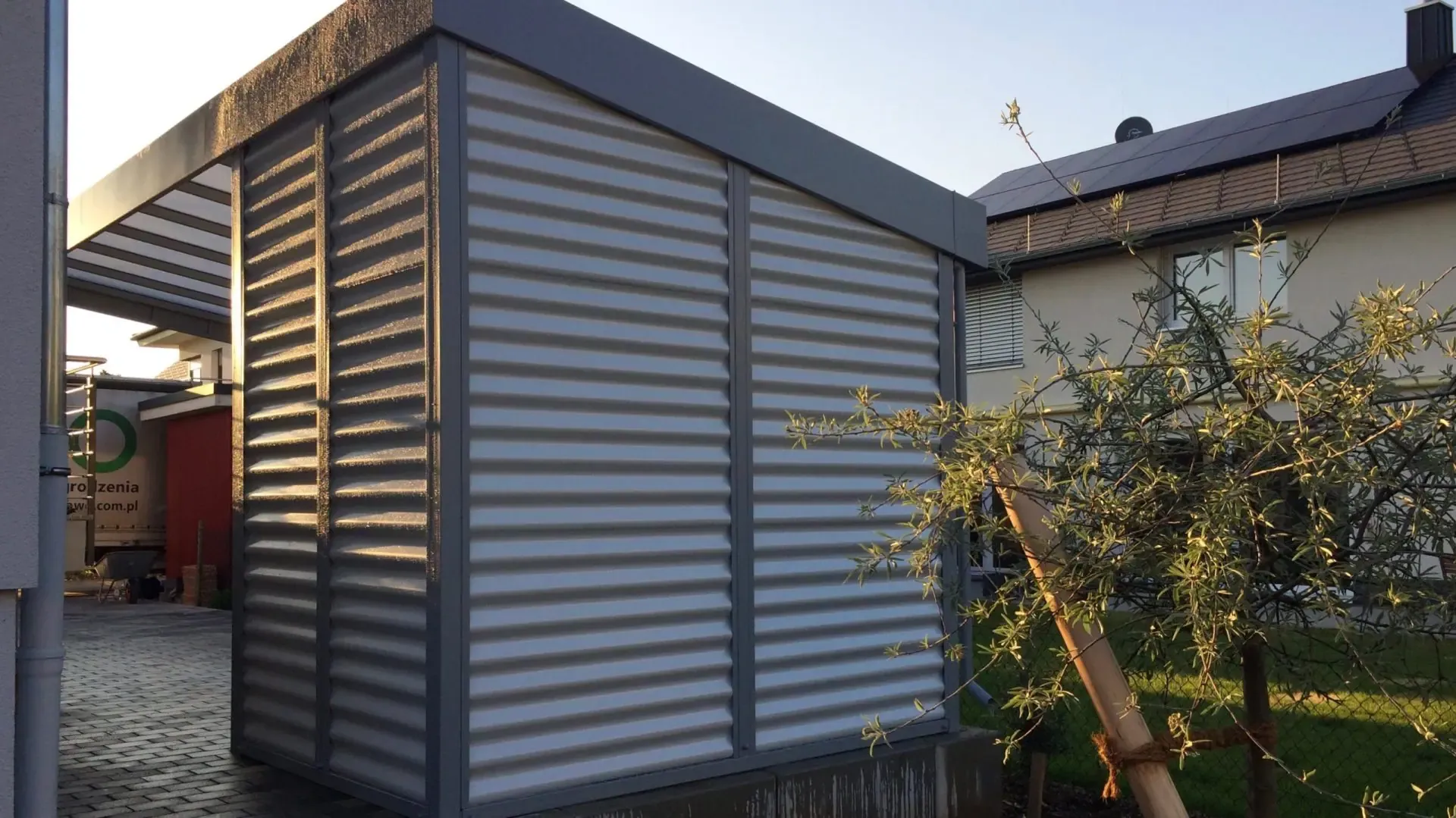 Als Farbe für diesen Carport mit Schuppen wurde RAL 9007 graualuminium gewählt.