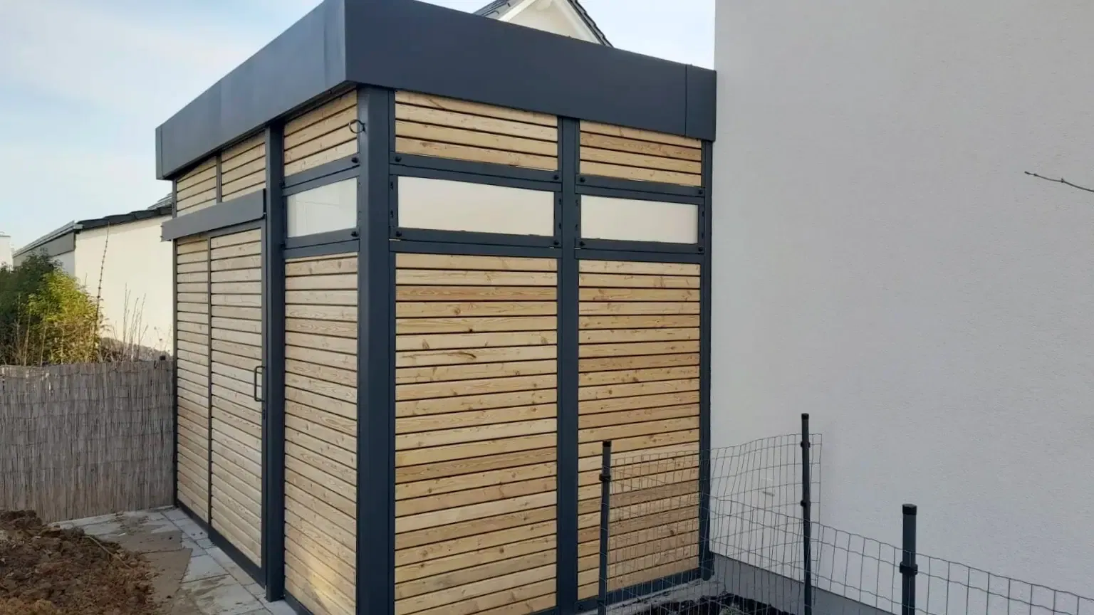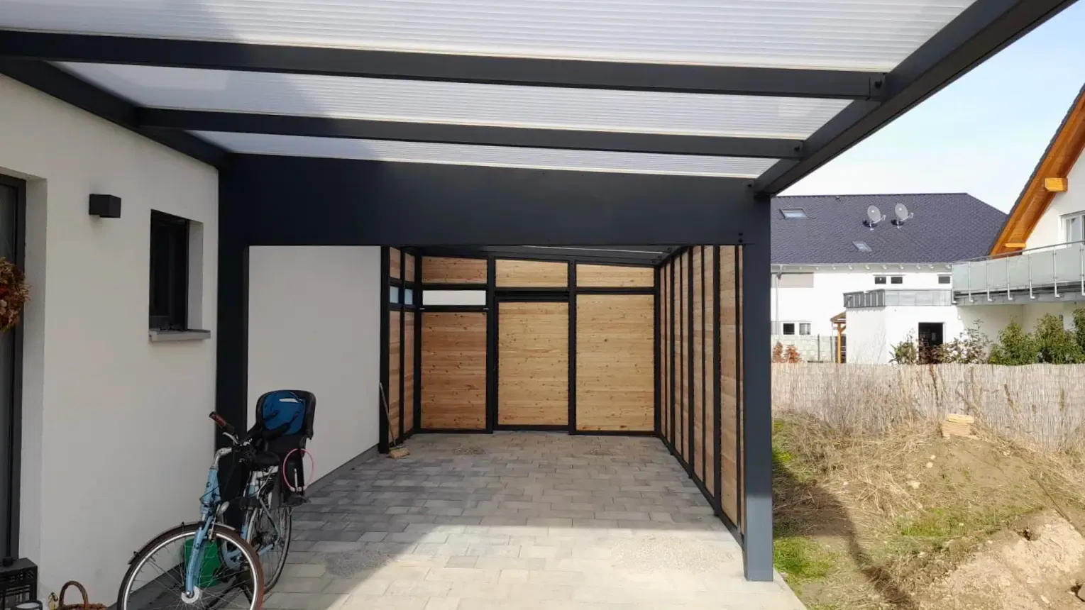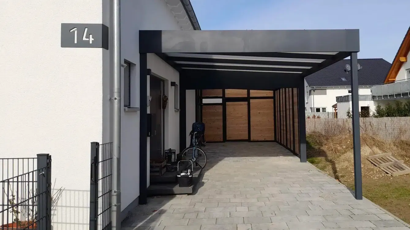 Bei diesem Carport mit Schuppen in Rheinland-Pfalz konnte unser Kunde von Beginn an auf zahlreiche Serviceleistungen von der Projektplanung bis zur Montage setzen.