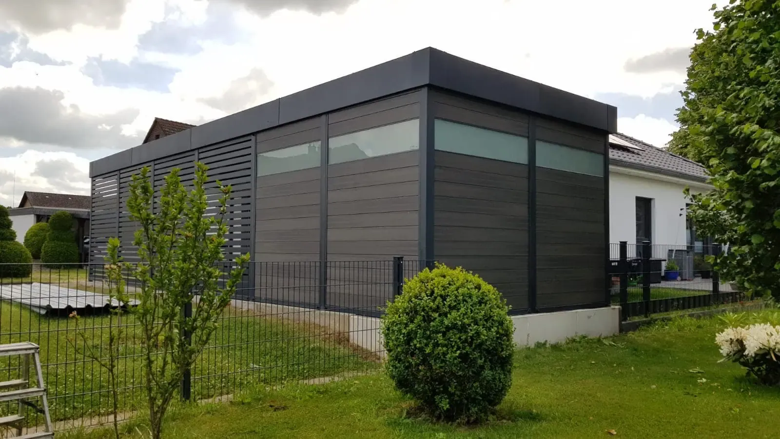 Die Kombination von Carport und Gartenhaus, ein Stahlcarport mit Schuppen, ist eine gefragte Variante, um Gebäude auf dem Grundstück in einem einheitlichen Design zu arrangieren.