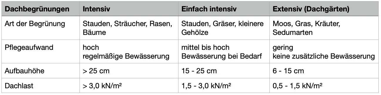 Diese kleine Übersicht erklärt die Unterschiede der möglichen Begrünungsarten anschaulich.