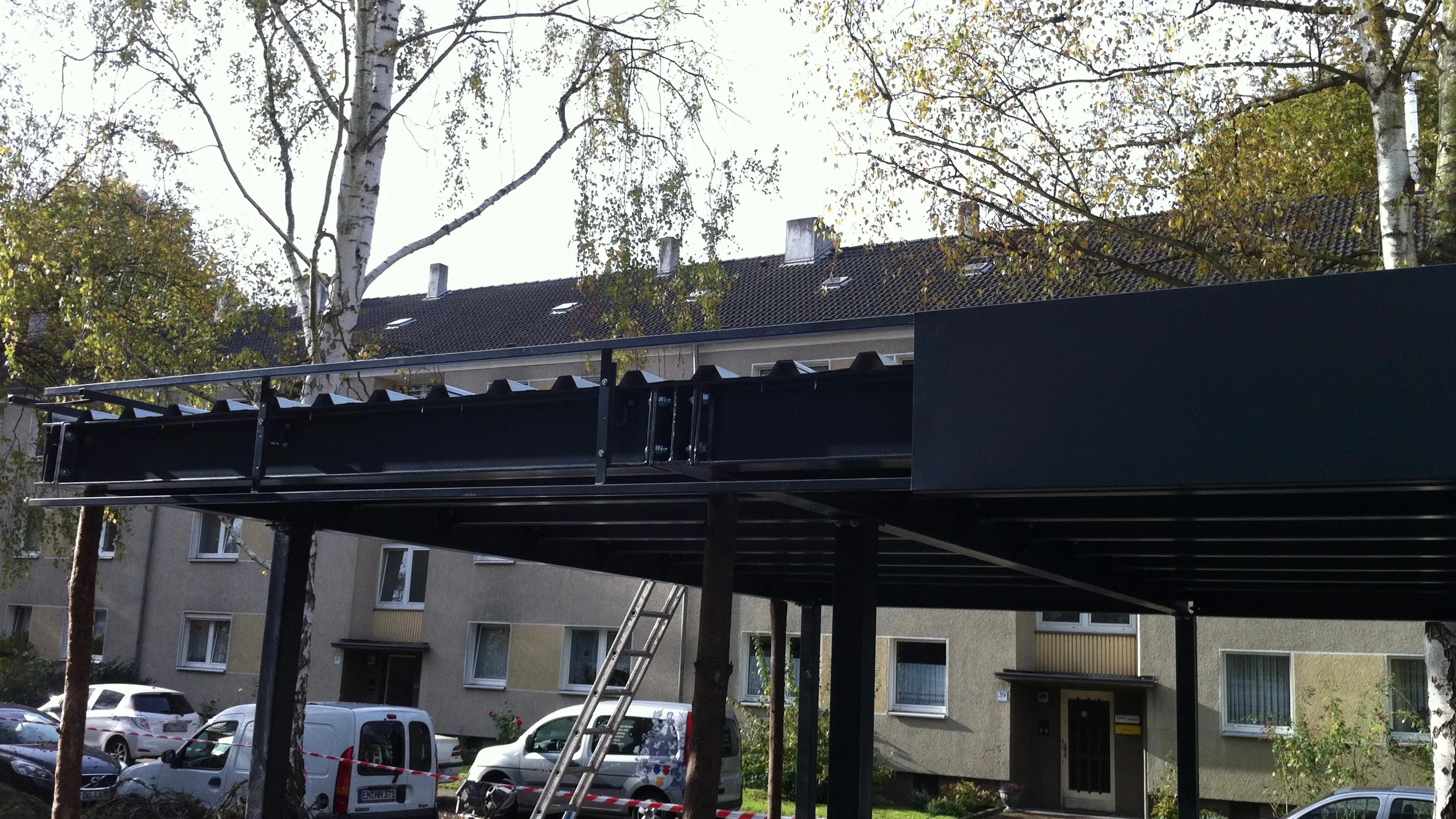 Die Dachkonstruktion eines Carports aus Metall besteht aus Rechteck-Stahlprofilen, Blechen, Regenrinnen und Fallrohren.