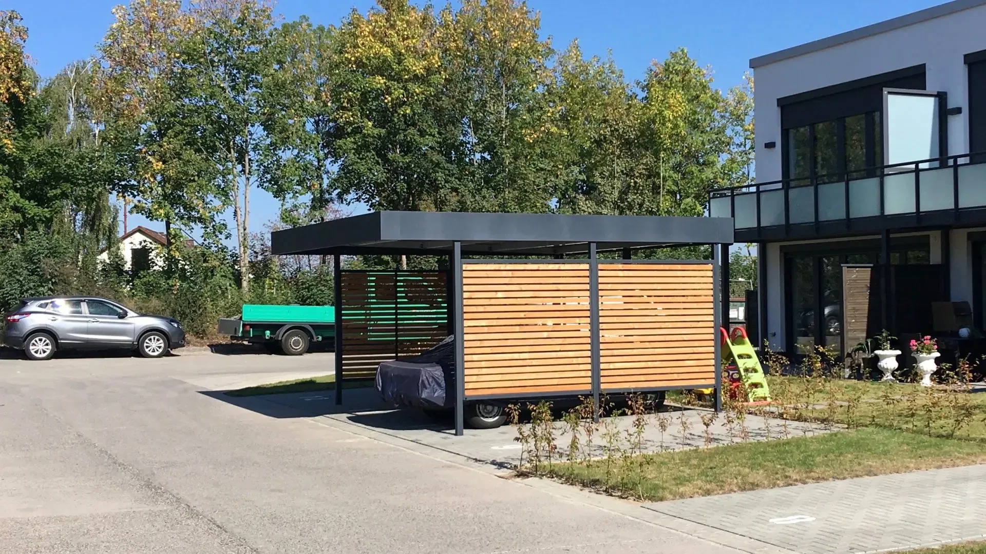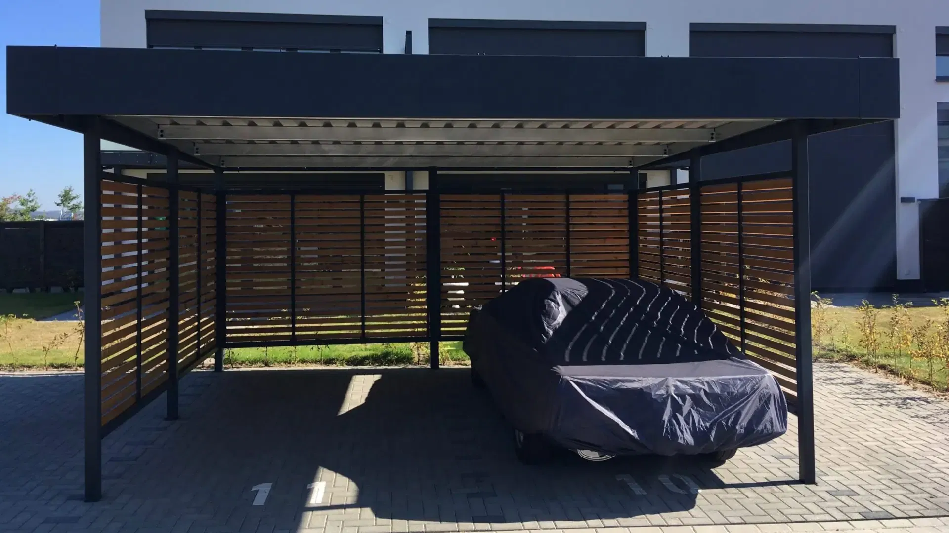 Bei diesem Doppelcarport in Rheinland-Pfalz konnte unser Kunde von Beginn an auf zahlreiche Serviceleistungen von der Projektplanung bis zur Montage setzen.