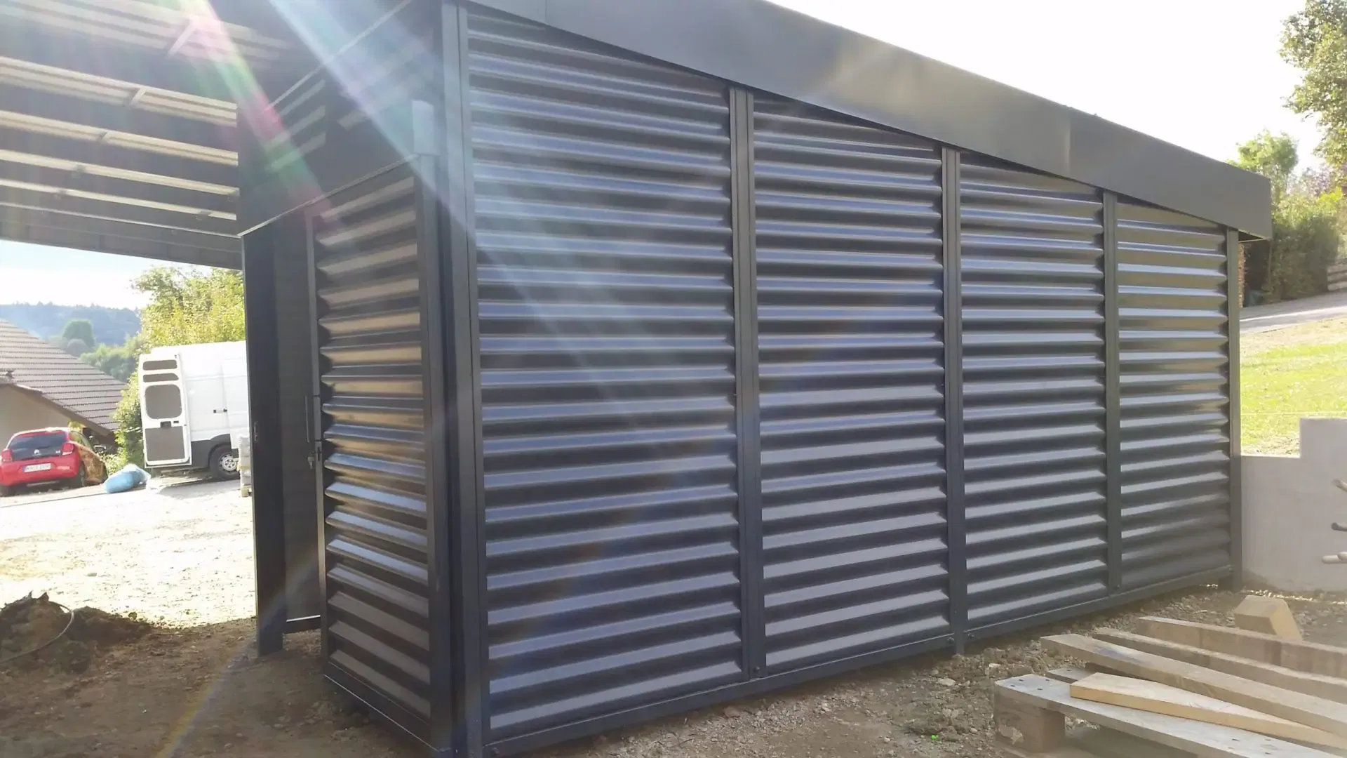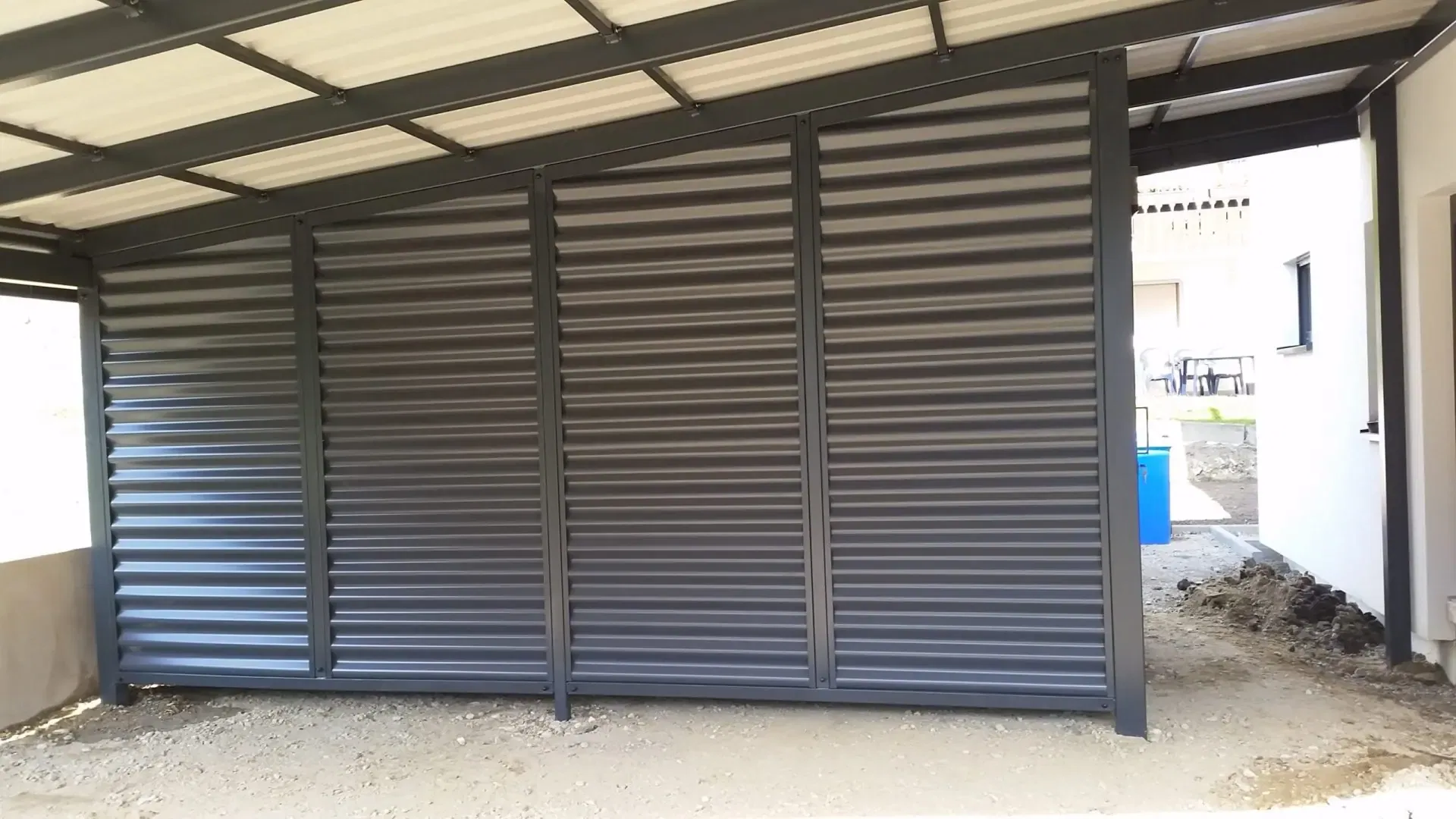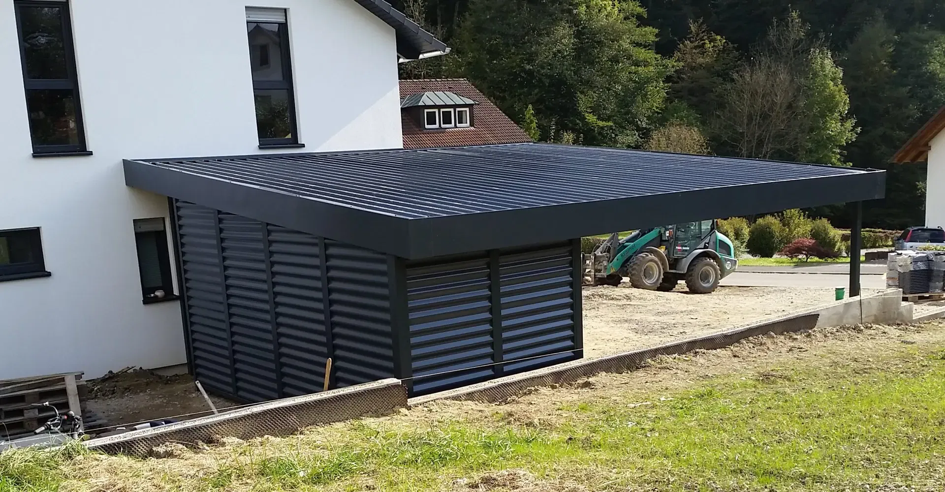 Als Farbe für diesen Doppelcarport mit Schuppen wurde RAL 7016 anthrazit gewählt.