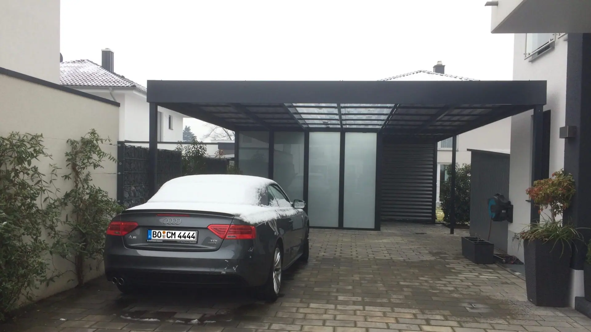 Als Farbe für diesen Doppelcarport mit Schuppen wurde RAL 7016 anthrazit gewählt.