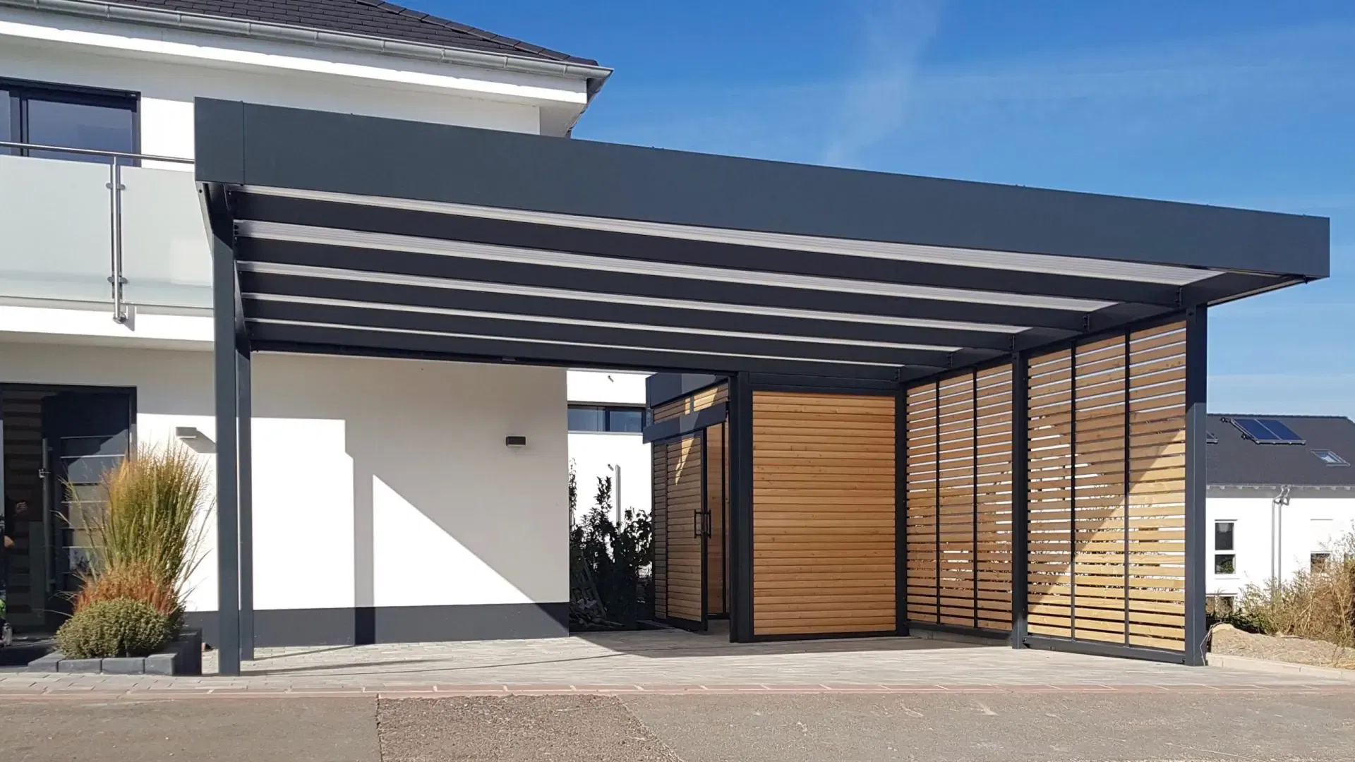 Bei diesem Doppelcarport mit Schuppen in Rheinland-Pfalz konnte unser Kunde von Beginn an auf zahlreiche Serviceleistungen von der Projektplanung bis zur Montage setzen.