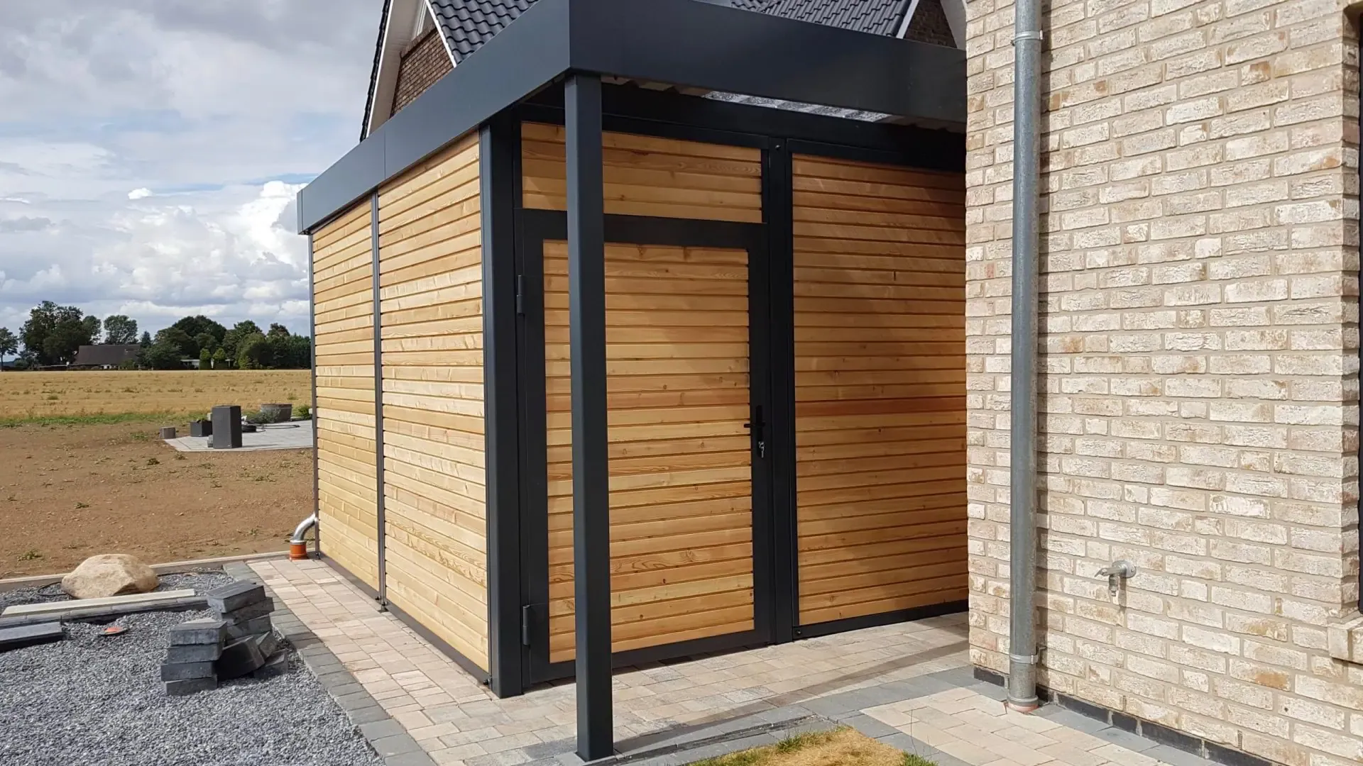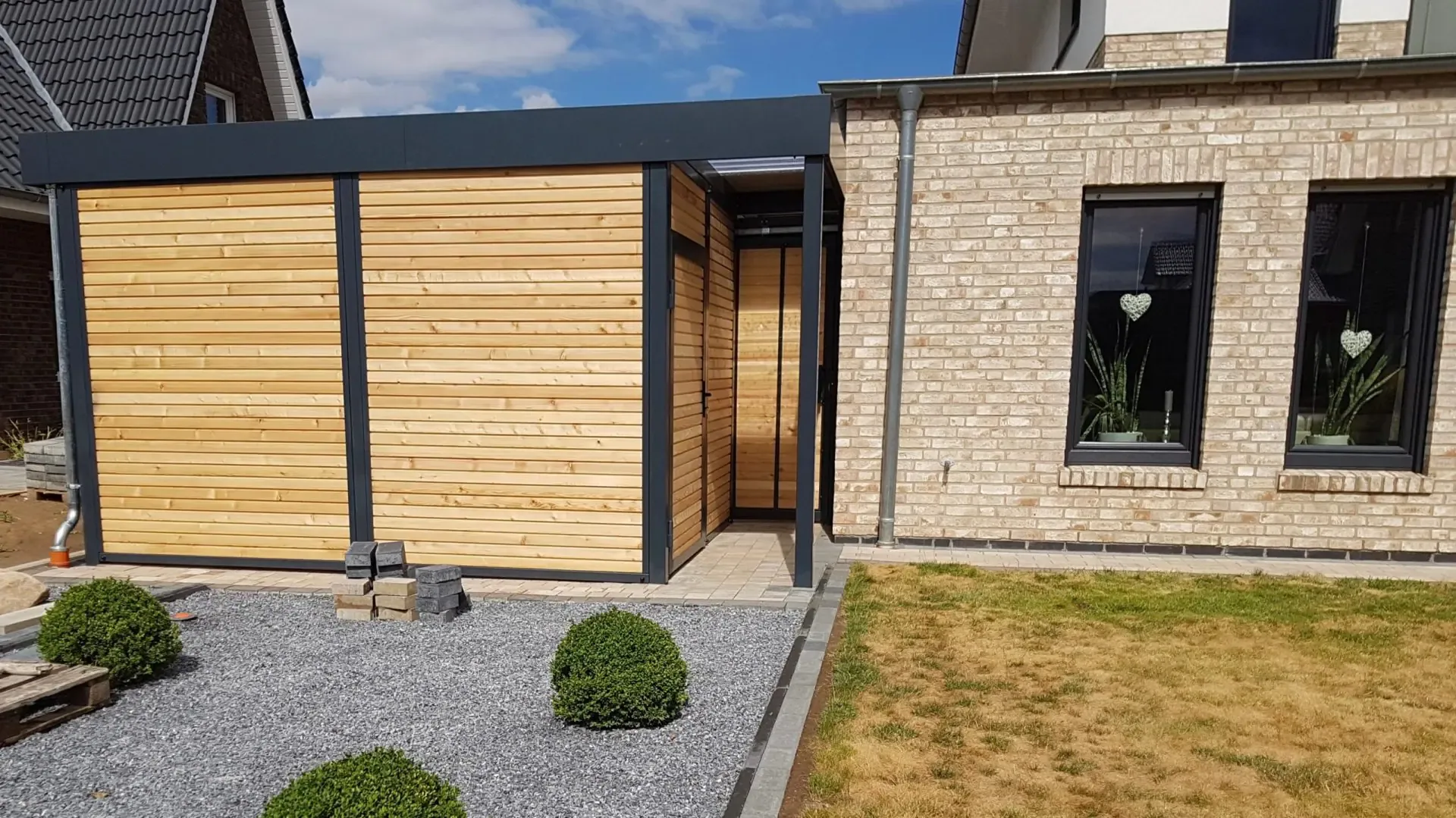 Als Farbe für diesen Doppelcarport mit Schuppen wurde RAL 7016 anthrazit gewählt.