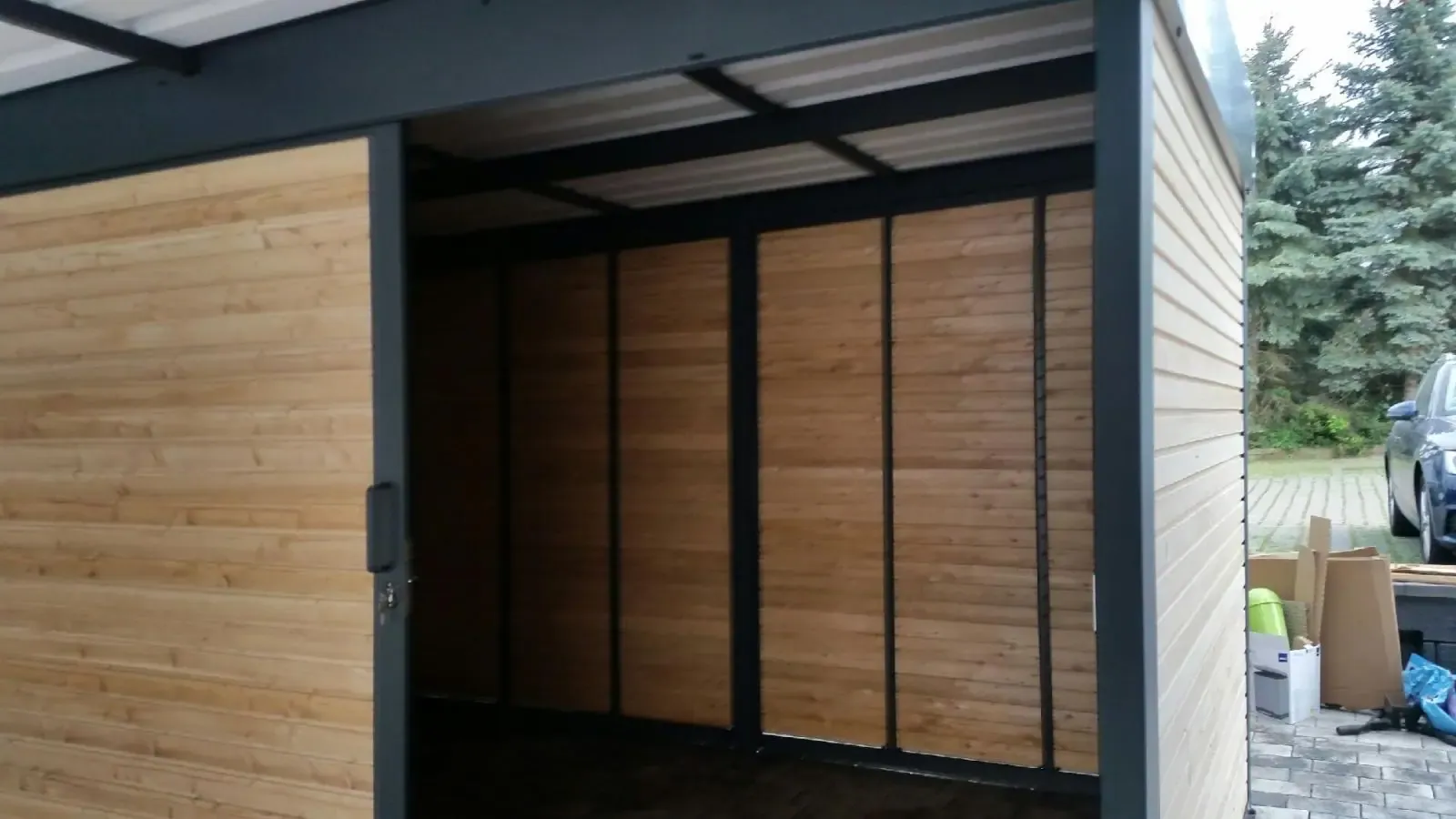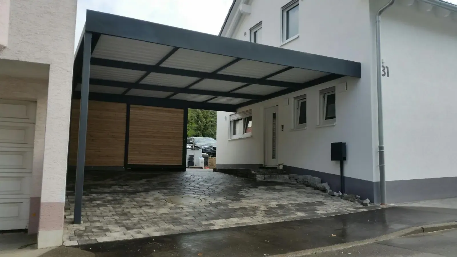 Als Farbe für diesen Doppelcarport mit Schuppen wurde RAL 7016 anthrazit gewählt.