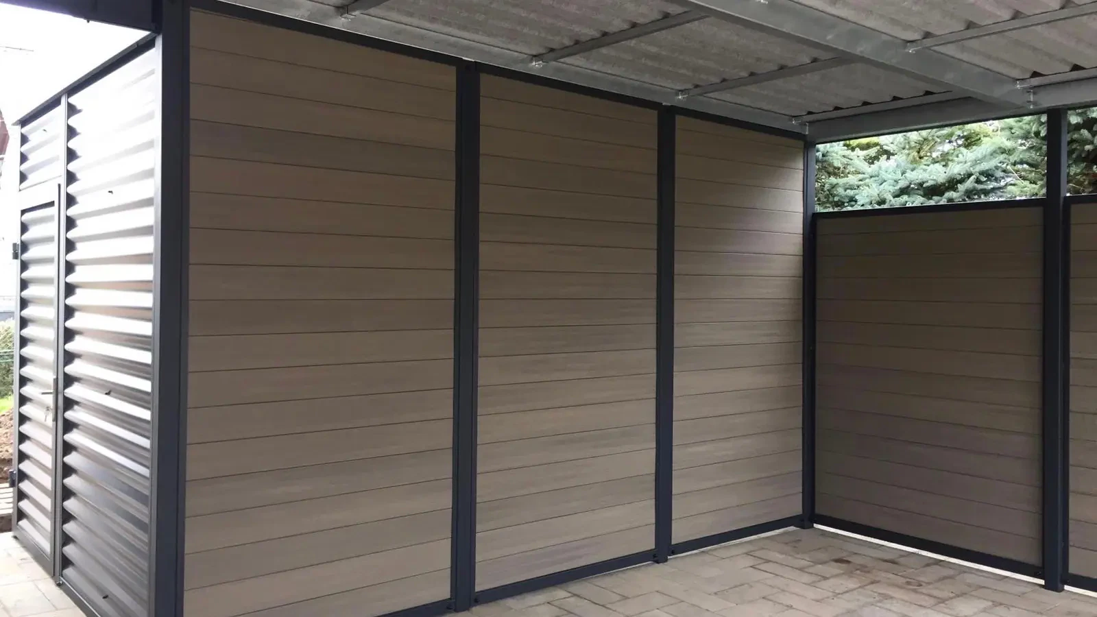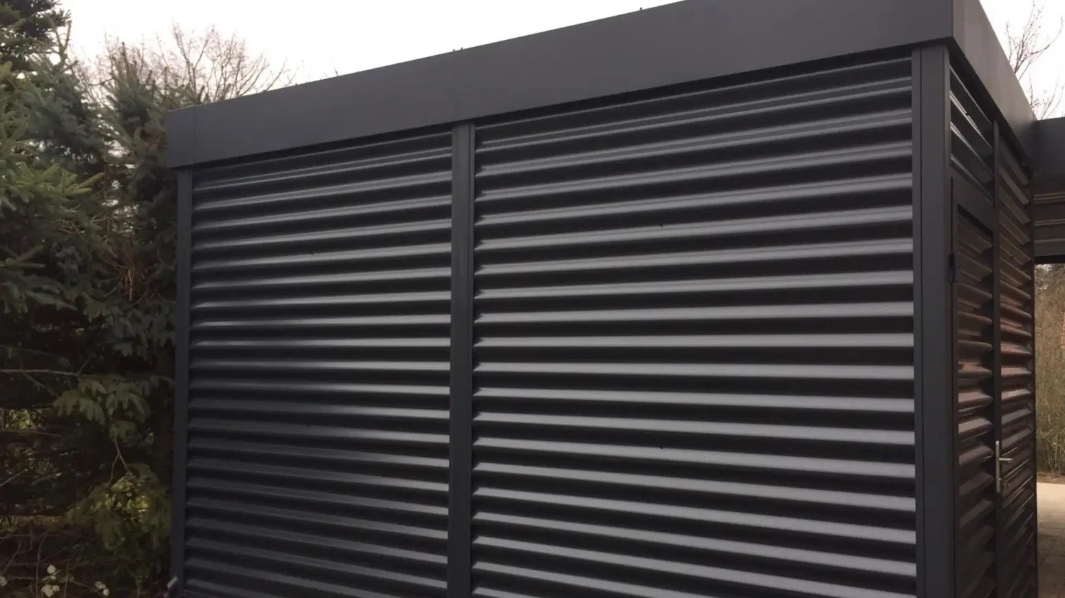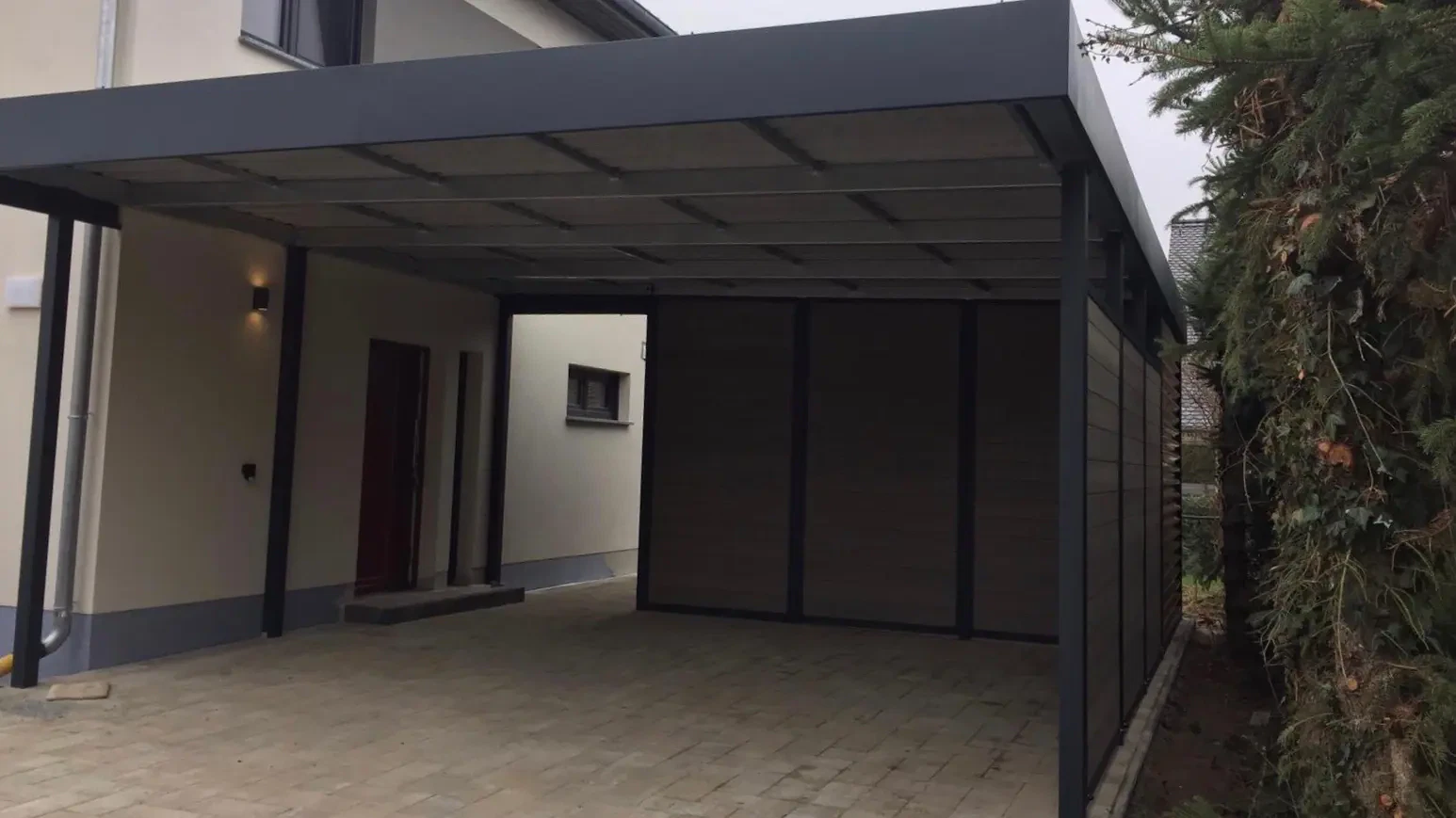 Als Farbe für diesen Doppelcarport mit Schuppen wurde RAL 7016 anthrazit gewählt.