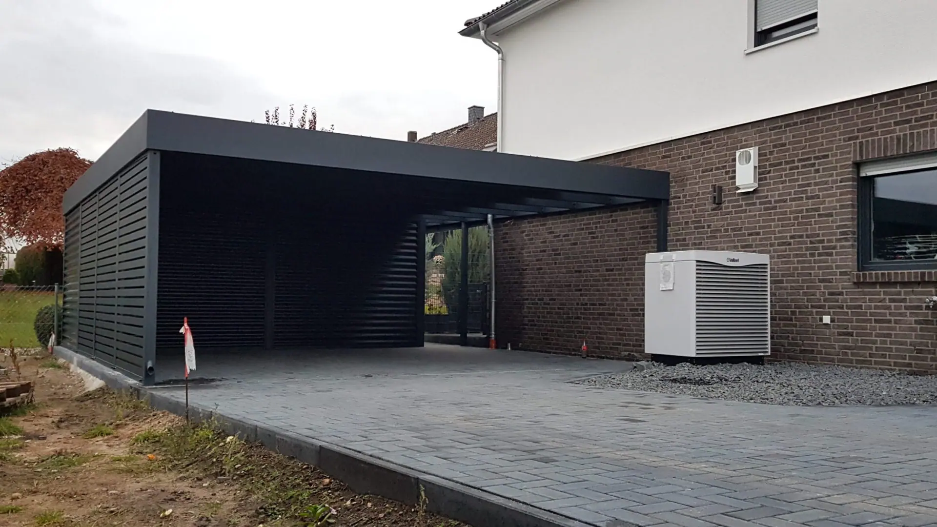 Als Farbe für diesen Doppelcarport mit Schuppen wurde RAL 7016 anthrazit gewählt.