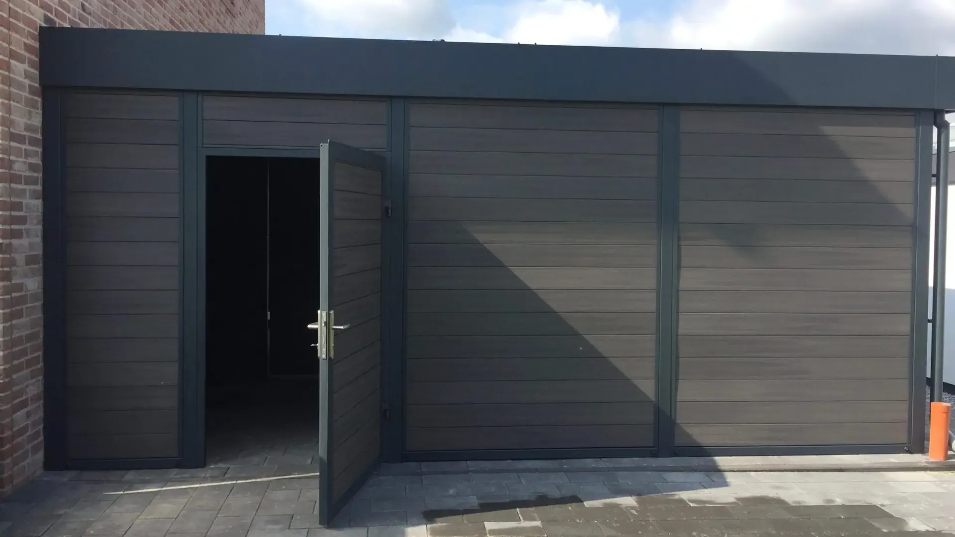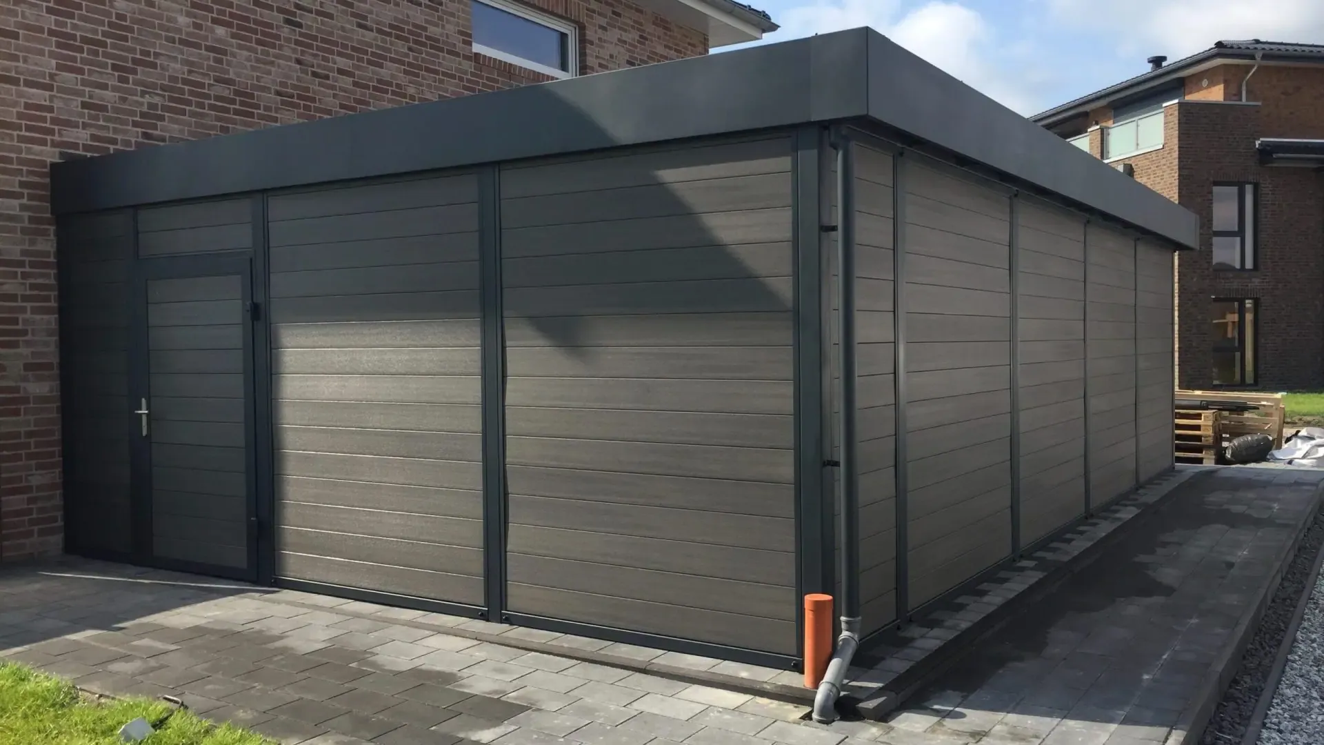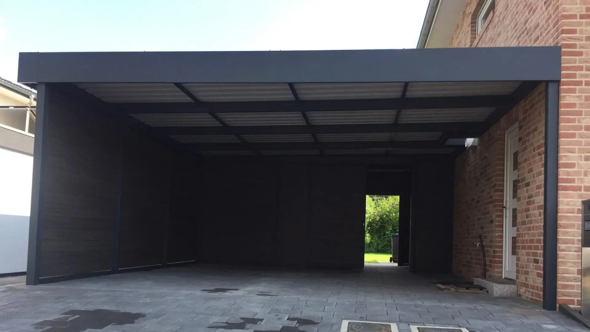 Als Farbe für diesen Doppelcarport mit Schuppen wurde RAL 7016 anthrazit gewählt.