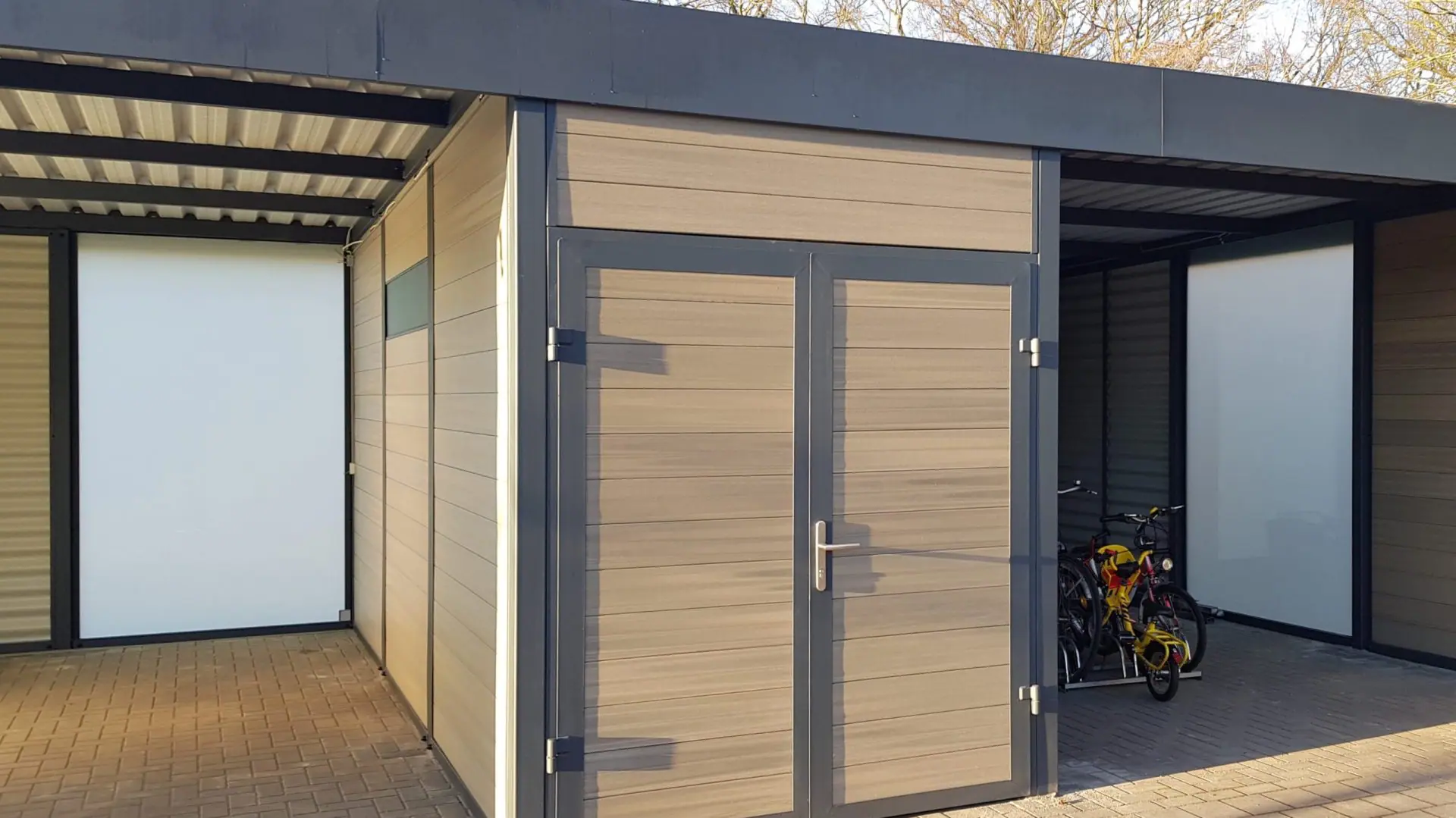Als Farbe für diesen Doppelcarport mit Schuppen wurde RAL 7016 anthrazit gewählt.