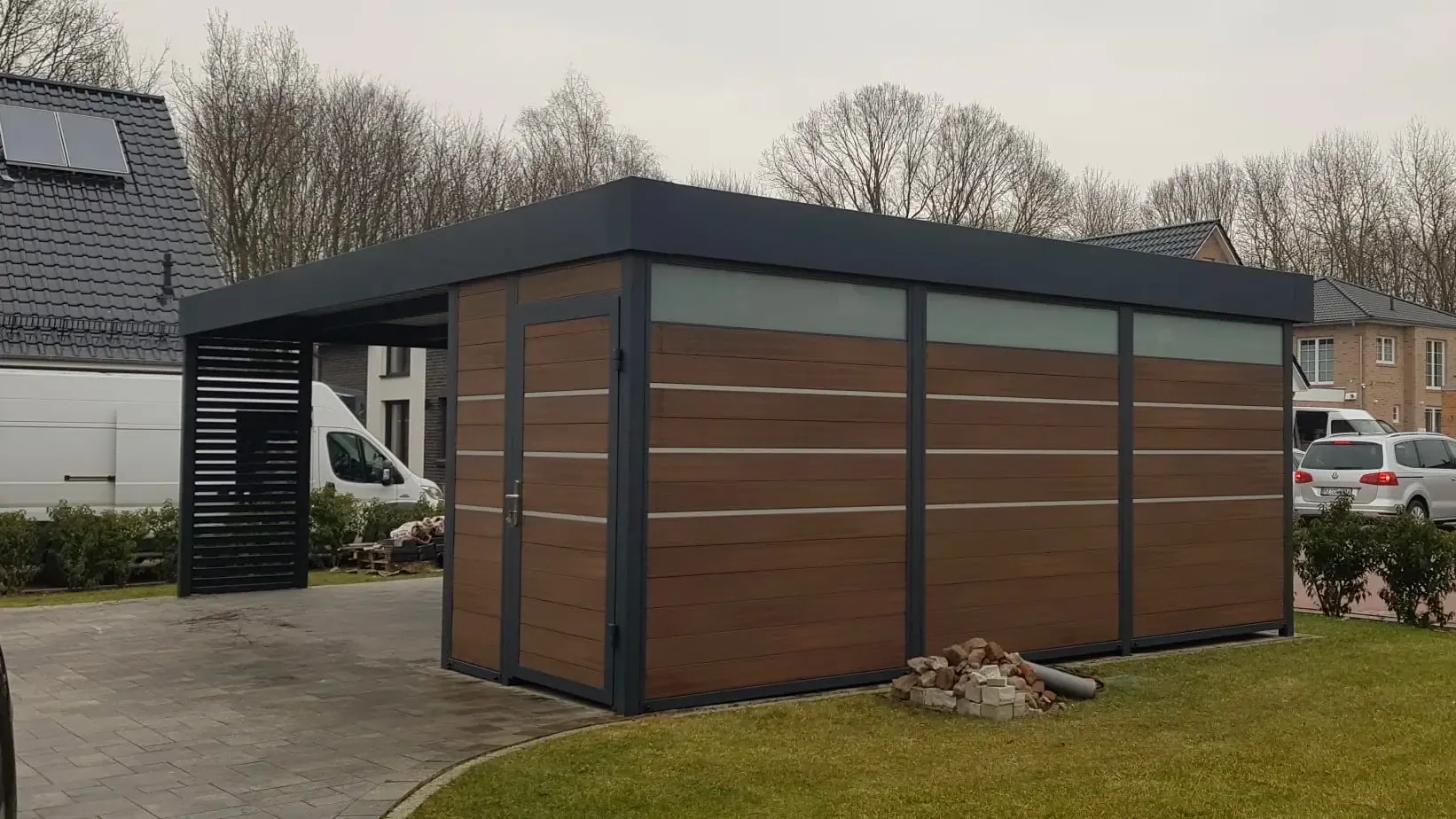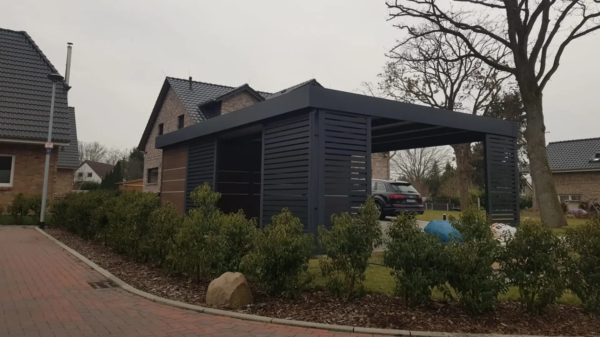 Als Farbe für diesen Doppelcarport mit Schuppen wurde RAL 7016 anthrazit gewählt. Bei Interesse am Preis für dieses Projekt nehmen Sie bitte Kontakt zu uns auf.