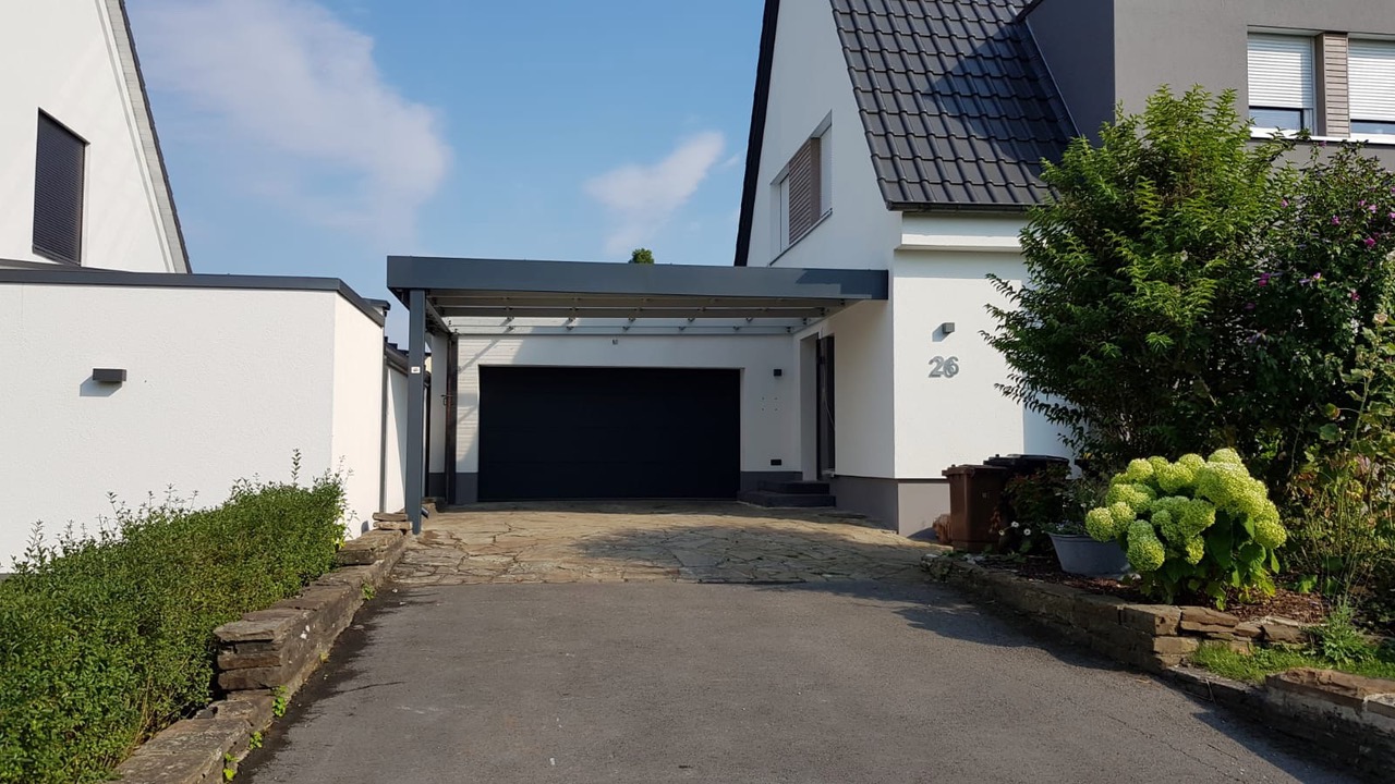 Die Bauherrn konnten einen Komplettservice genießen. Von der Planung bis zur Montage des Doppelcarports wurde alles von Carportmaster erledigt. Auch um die Erstellung der Punktfundamente und den Anschluss der Entwässerung an vorhandene Systeme mussten sich die Bauherrn nicht kümmern.