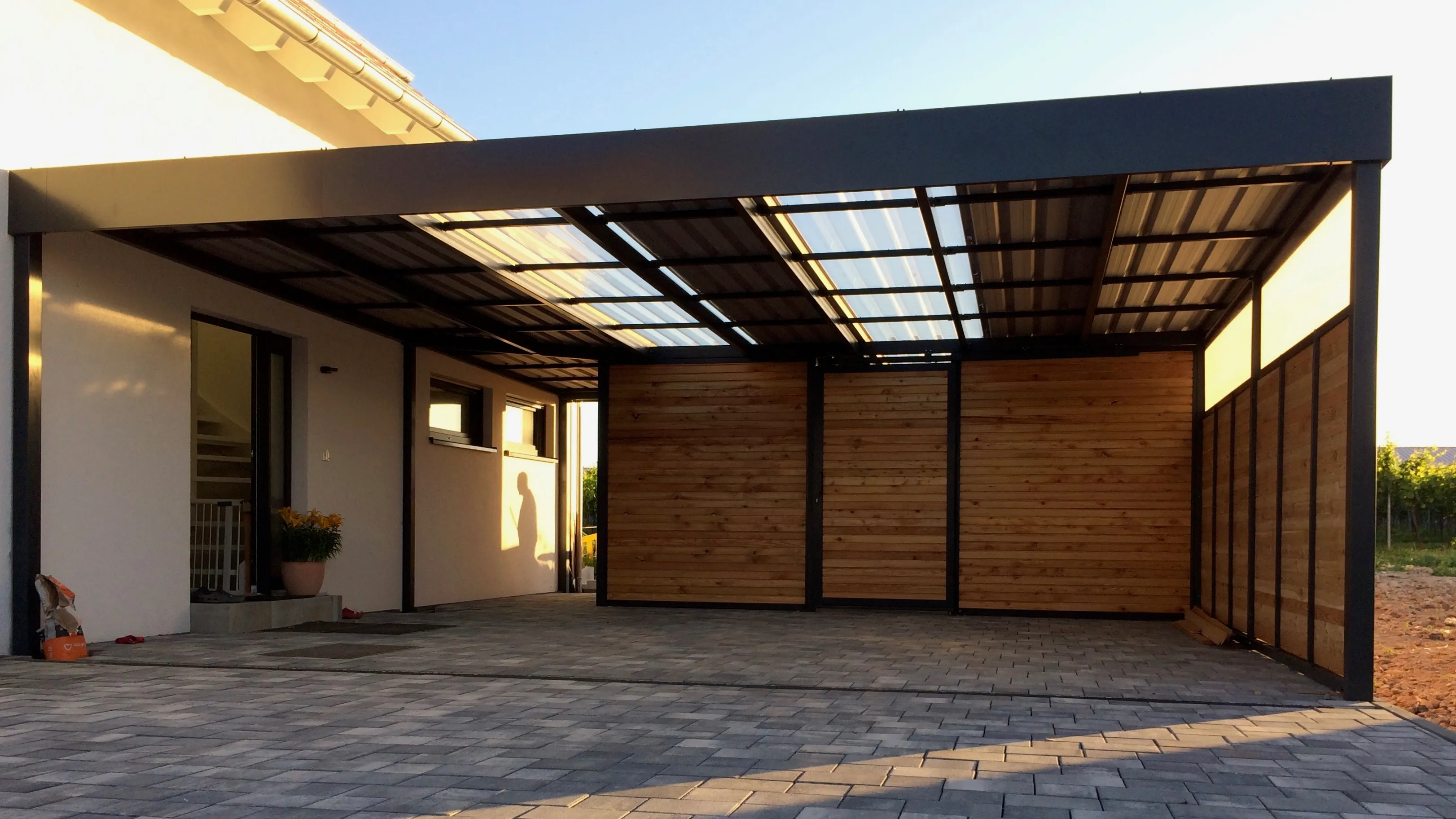 Trapezblech aus Stahl, oft kombiniert mit transparenten Trapez-Lichtplatten aus solidem PVC, sind die Klassiker zur Konstruktion von Carportdächern.